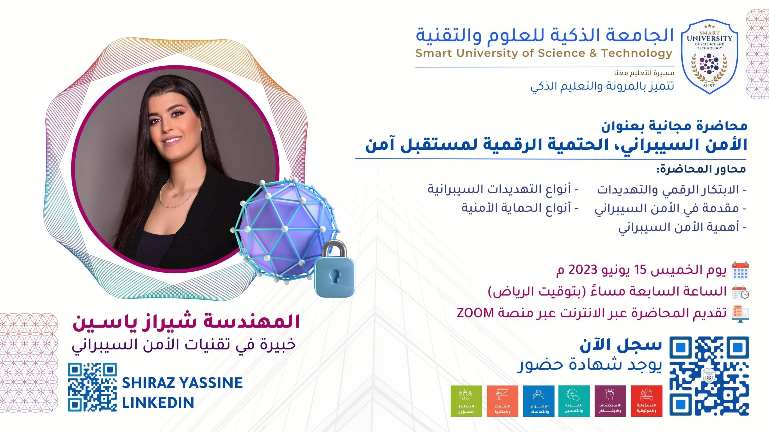 Announces #Smart_University_of_Sciences_and_Technology #SUST on A lecture entitled Cybersecurity, The digital imperative for a secure future with engineer Shiraz Yassin On Thursday, June 15, 2023 AD, at seven in the evening (Riyadh time), the lecture will be presented online via the ZOOM platform. Registration via the following link: